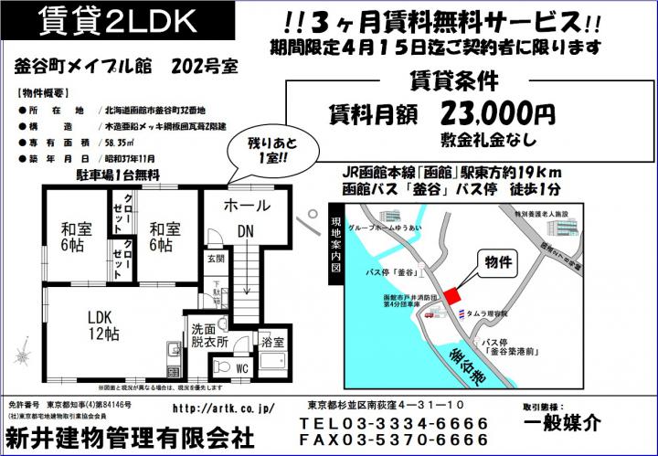 | 物件名 | 函館市釜谷町32番地 メイプル舘202号室 2LDK 23,000円 |