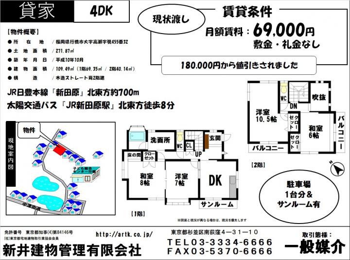 JR日豊本線『新田原』駅 北東方 約700m | 行橋市大字高瀬字覗455番32 | 4 DK | 109.49㎡(1階69.35㎡/2階40.14㎡) | 1998年03月 | 39,700円 | なし なし |