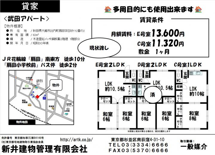 JR花輪線『扇田』駅 南東方 約900m 徒歩 10分 | 大館市比内町扇田字白砂112番の2 武田アパートC号室 | 1 LDK | 35.7㎡ | 1955年00月 | 11,320円 なし | 1ヶ月 なし |