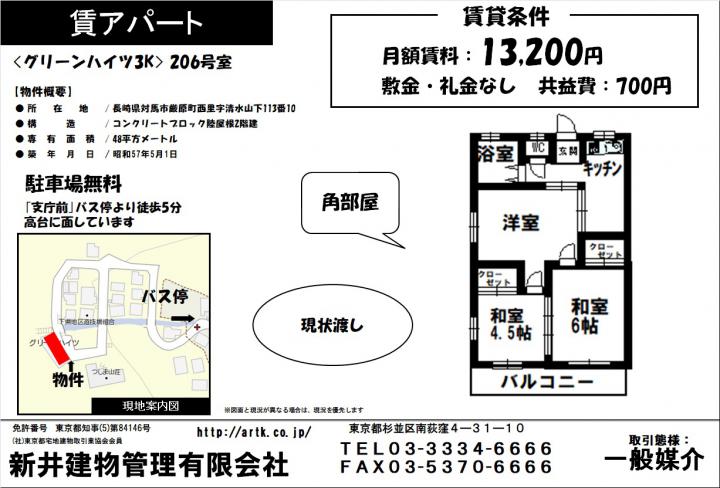 【賃貸物件】対馬市厳原西里113-10グリーンハイツ206 3K 23,000円(アパート)|厳原港 約1.8㎞|新井建物管理|全国の不動産、収益物件、中古住宅、賃貸・売買物件