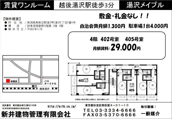 【賃貸物件】南魚沼郡湯沢町湯沢2-5-4 メイプル館102/402/405号室 1R 29,000円    (マンション)|JR上越線「越後湯沢」駅徒歩3分  バス停「温泉街入口」至近|新井建物管理|全国の不動産、収益物件、中古住宅、賃貸・売買物件