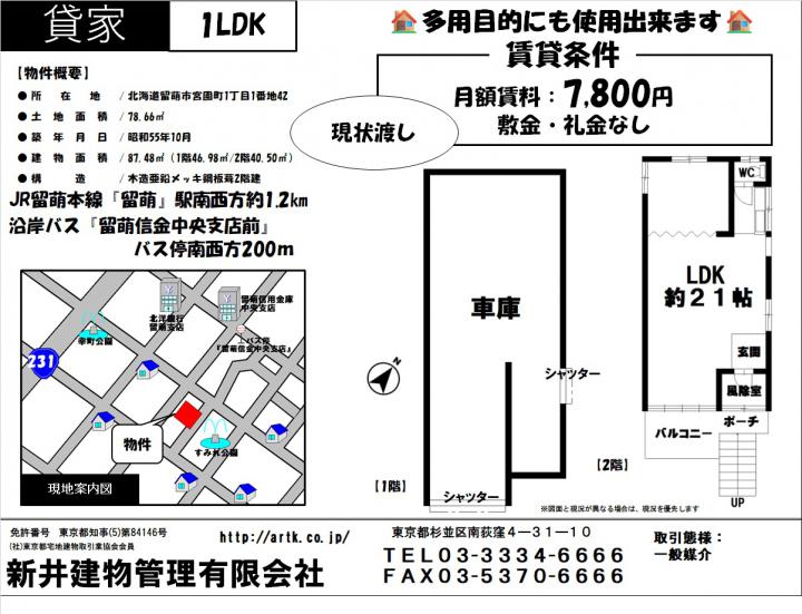 | 物件名 | 留萌市宮園町1丁目1番地42 1LDK 7,800円 |