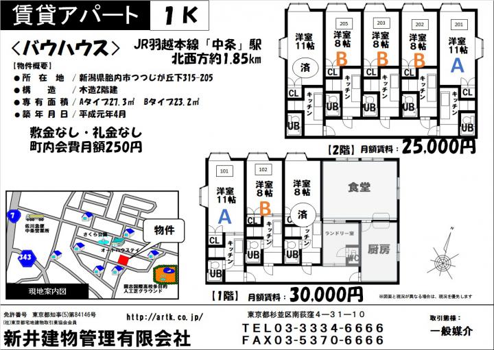 | 物件名 | 胎内市つつじヶ丘下315-205 バウハウス2階 1K 25,000円 |