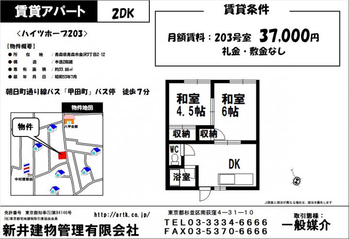 | 物件名 | 青森市金沢3丁目2-12 ハイツホープ203号室 2DK 37,000円 |
