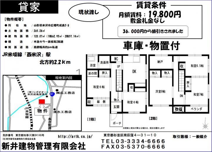 【賃貸物件】米沢市広幡町成島3-8 5DK 19,800円(一戸建て)|JR米坂線『西米沢』駅 北方約2.2km|新井建物管理|全国の不動産、収益物件、中古住宅、賃貸・売買物件
