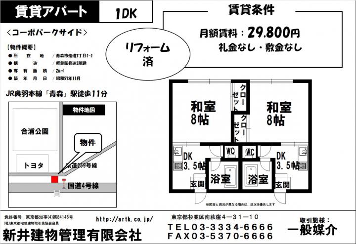 JR奥羽線『青森』駅 徒歩 11分 | 青森市造道3丁目1-1 コーポパークサイド101 | 1 DK | 26㎡ | 1982年11月 | 29,800円 なし | なし なし |