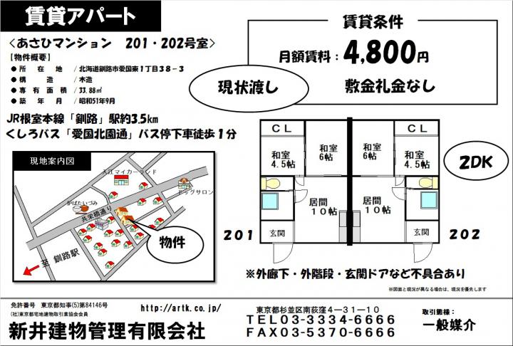 | 物件名 | 釧路市愛国東1丁目 あさひマンション202 2DK 4,800円 |