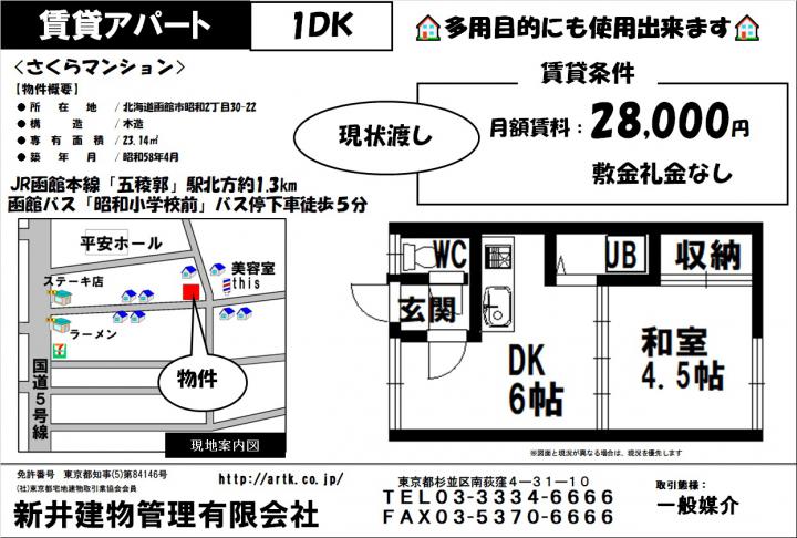 | 物件名 | 函館市昭和2丁目30-22 さくらマンション 1DK 28,000円 |