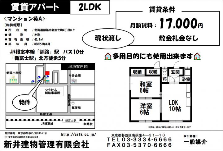 | 物件名 | 釧路市新富士町4丁目8-9 マンション英A 2LDK 17,000円 |