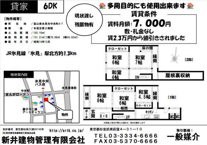 | 物件名 | 富山県氷見市中央町4-7 6DK 5,100円 |