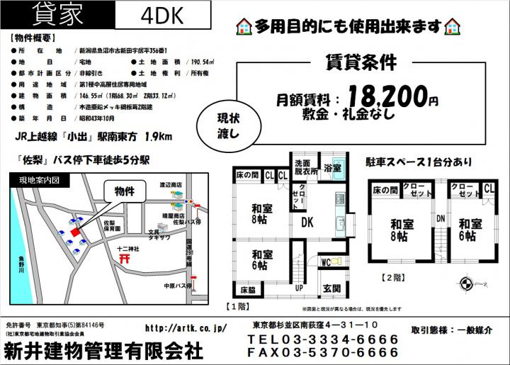| 物件名 | 新潟県魚沼市古新田356-1 4DK 9,800円 |