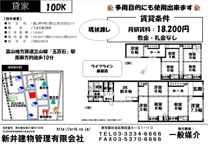 物件名富山県中新川郡立山町五百石27-5 10DK 18,200円