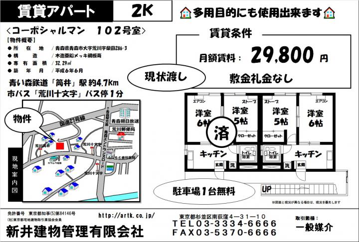 | 物件名 | 青森県青森市大字荒川字柴田286-3コーポシャルマン 102 2K 29,800円 |