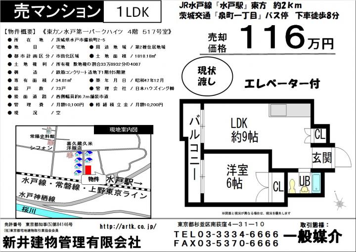 水戸市備前町2-5東カン水戸第一パークハイツ517 1LDK 116万円 116万円/ 1 LDK JR水戸線『水戸』駅 東方 約2km 茨城交通『泉町一丁目』バス停 水戸市備前町2-5東カン水戸第一パークハイツ517 1LDK 116万円【設備】水道料月額4,215円 |
