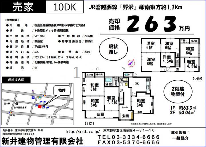 耶麻郡西会津町野沢字田町乙36番1 10DK 263万円 263万円/ 5 DK JR磐越西線『野沢』駅 南東方約1.1㎞ 車 16km 耶麻郡西会津町野沢字田町乙36番1 10DK 263万円 |
