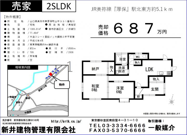 美祢市東厚保町山中991-10 2SLDK 687万円 687万円/ 2 LDK JR美祢線『厚保』駅 北東方約5.1km 美祢市東厚保町山中991-10 2SLDK 687万円 |
