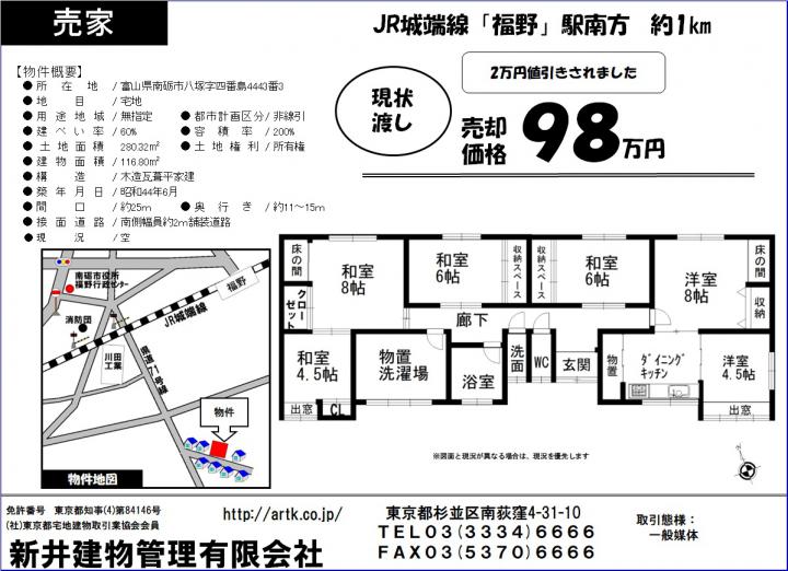 | 物件名 | S南砺市八塚字四番島4443番3 7DK 98万 |