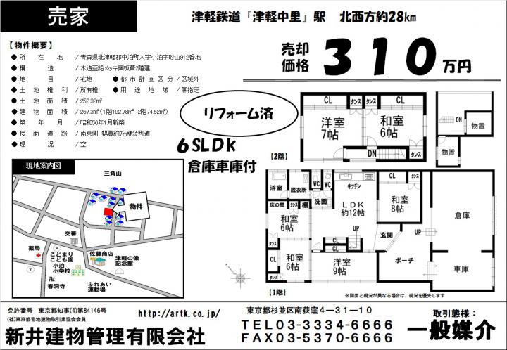 | 物件名 | 北津軽郡中泊町大字小泊字砂山912番地 6SLDK+倉庫車庫 198万円 |