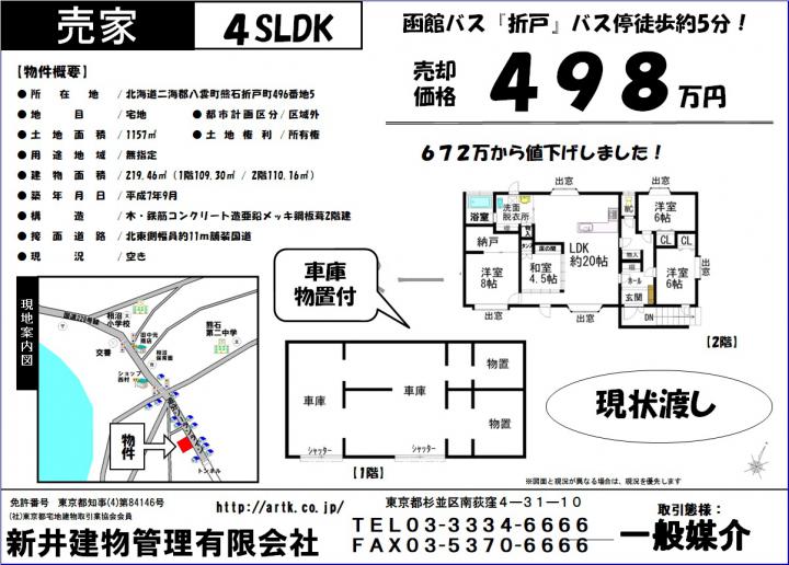 | 物件名 | 二海郡八雲町熊石折戸町496番地5 4SLDK+車庫倉庫 320万円 |