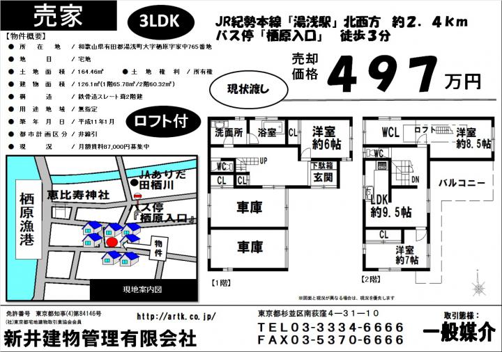| 物件名 | 有田郡湯浅町大字栖原字家中765番地 3LDK 車庫・ロフト付 497万円 |