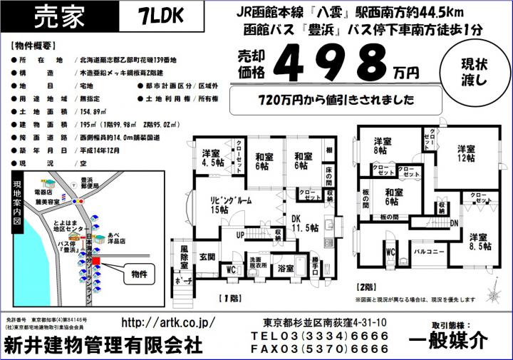 JR函館本線『八雲』駅 南西方約44.5km | 爾志郡乙部町花磯139 | 専有面積/195㎡(1階99.98㎡ 2階95.02㎡) 土地/154.89㎡ 建物/195㎡(1階99.98㎡ 2階95.02㎡) | 2002年12月 | 280万円 | 5 LDK |