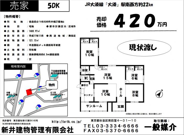 JR大湊線『大湊』駅南西方約22㎞ 車 30分 | 青森県むつ市川内町中畑27番地6 | 専有面積/121.13㎡ 土地/1400.97㎡ 建物/121.13㎡ | 2005年11月 | 198万円 | 5 DK |