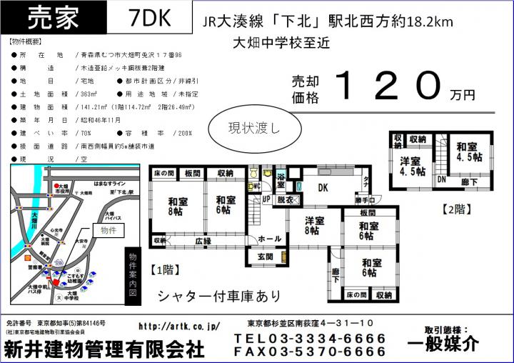 | 物件名 | むつ市大畑町兎沢17-96 7DK 120万円 |